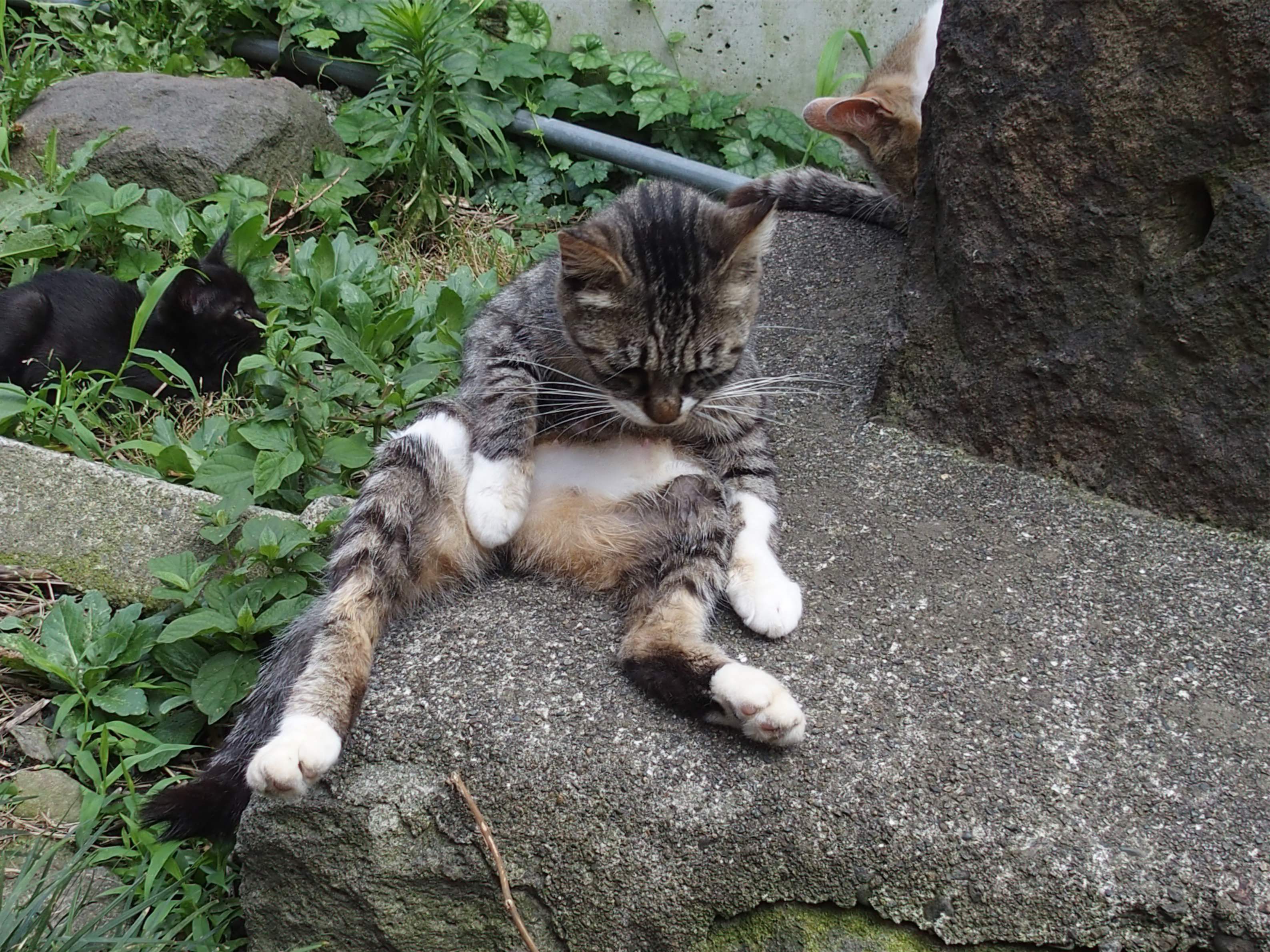 H隊長さん すみません、このところスパムが物凄くてぬこさんからのコメントを頂いた時点でコメント爛を閉じてしまっていました。 もう半端じゃない量があっという間に送られてくるんです。 ニャンってこんな風にぺたんと座るんですねえ。確かに尻餅みたい。 さすがにこの格好でウトウトはしておらず舐めてましたね。 尻尾は丁度、石の縁から出てる感じですかね。