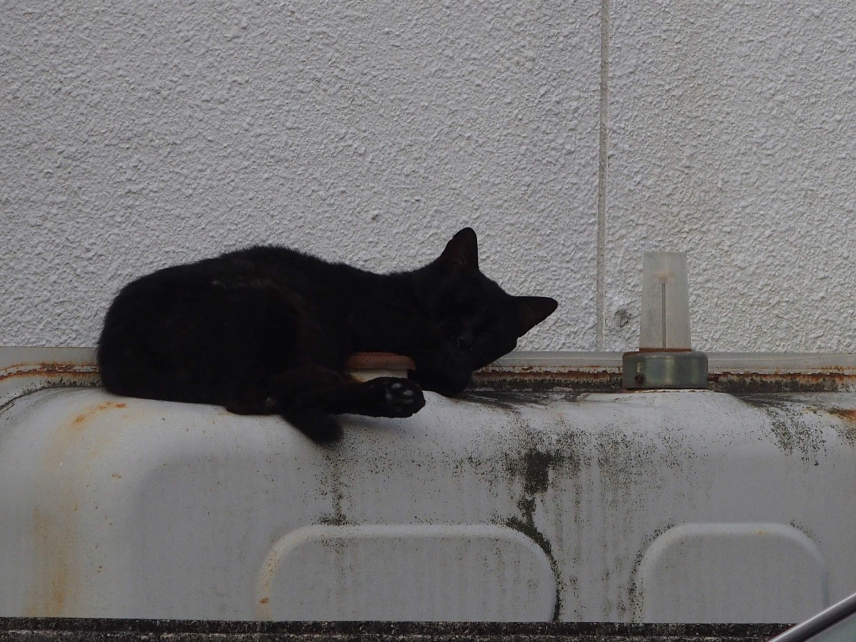 タンクのふたを抱き込んで よく寝れますね 相当狭いと思うけど 太陽の熱で タンクが暖かかったのかな でも逆ですね 黒猫の熱で タンクが温まるんだ
