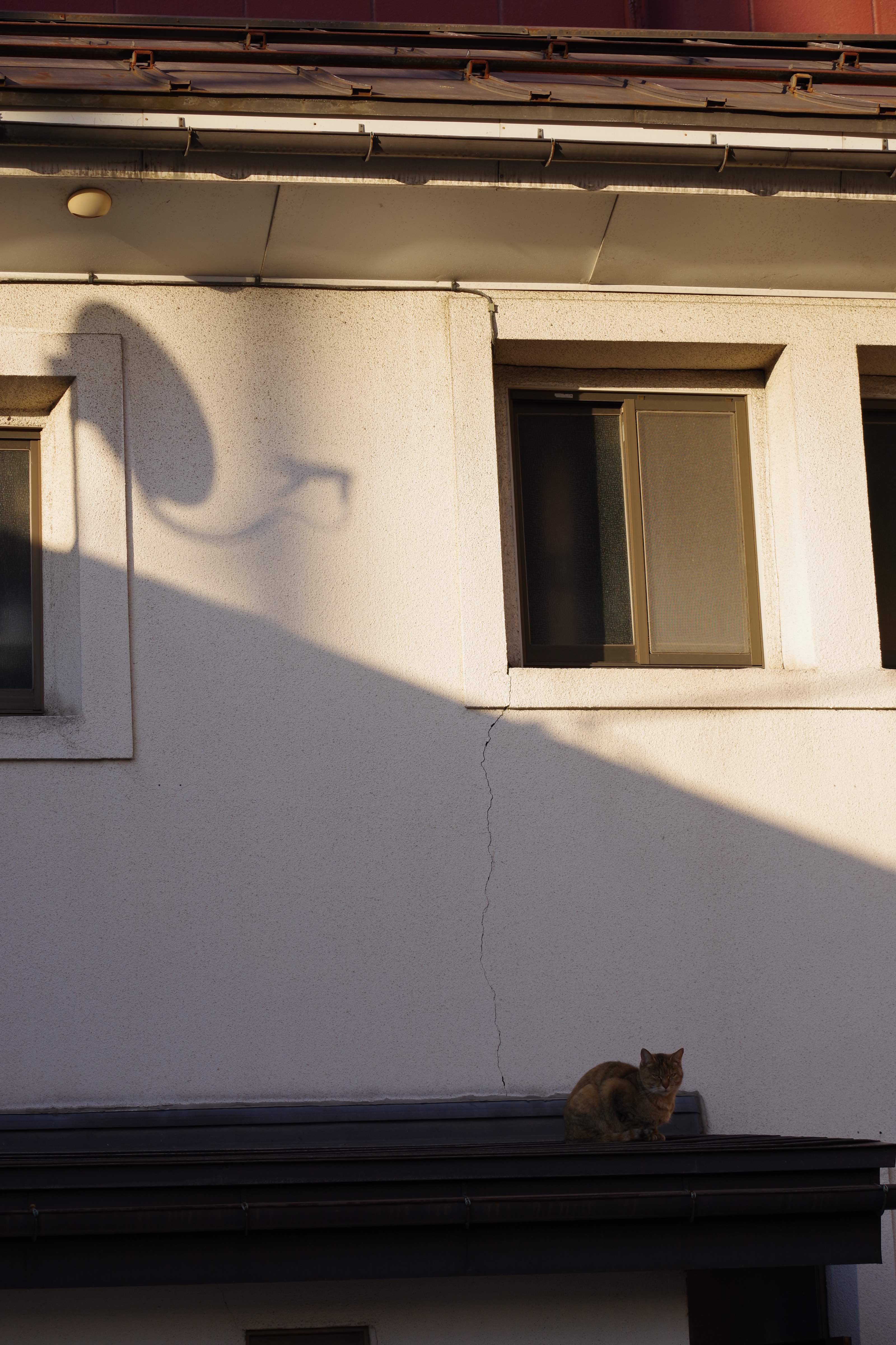 あら…猫さん 日陰になっちゃった 寒くないのかな パラボラアンテナの影が もっと向こうにいくと日が当たってるよ‼️って教えてくれてるみたい にゃん『日向に行きたいけど屋根がここで…』 ありゃ(/ロ゜)/