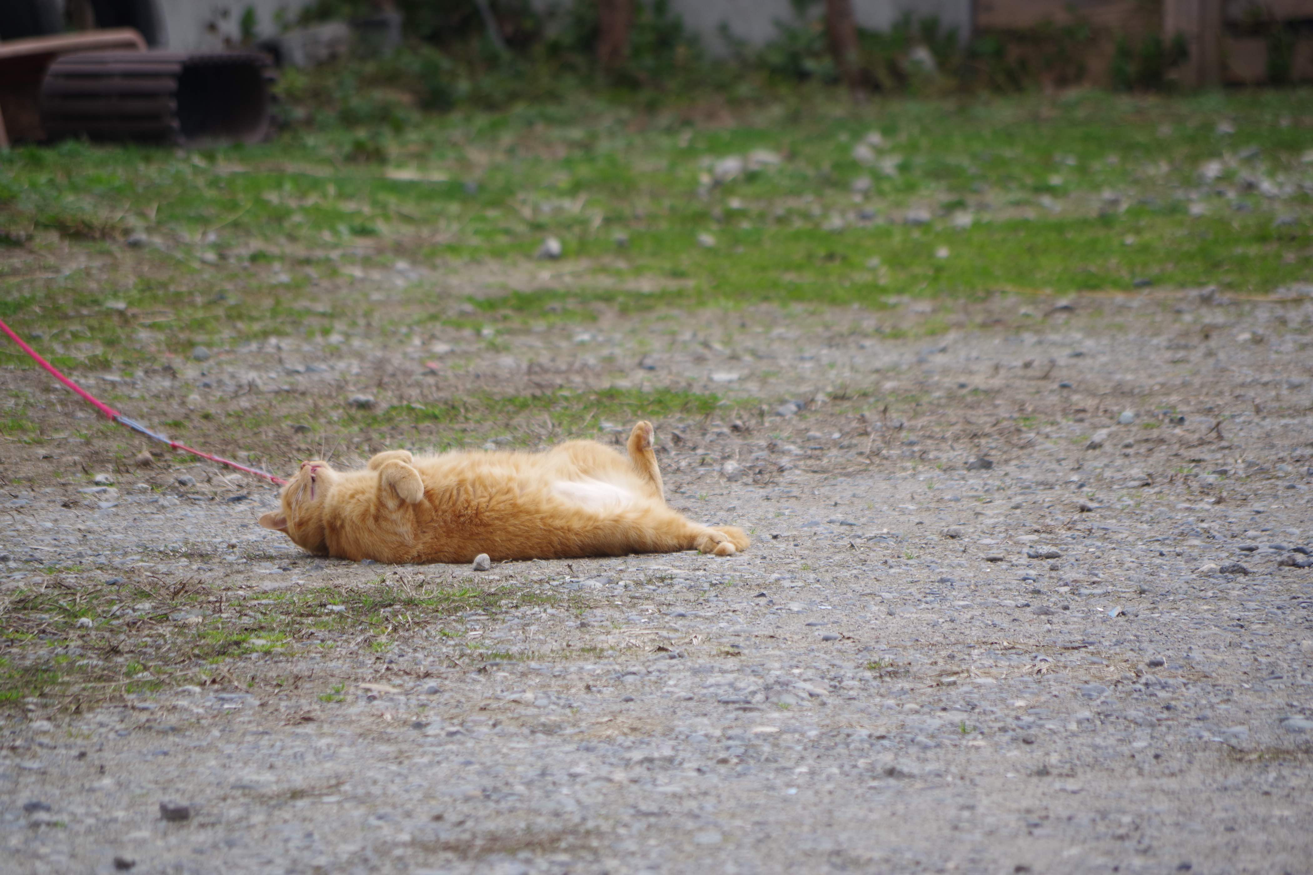 ぬこさん 飼い猫のみーちゃん、時々こうして広い所に出してもらえます。 リードで繋がれたままですけど。 車の心配もないし伸び伸び出来ますよね。 だけど万が一の為の小石か(笑) ところで飼い主さんに「みーちゃん」という名前を聞いた時に「女の子なんですね」と言ったら、「いや、男の子」ですって。