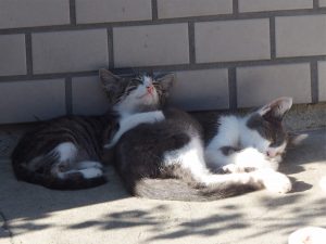 こりゃたまりませんねえ 大きさが違うけど 同い年? ちっちゃい子は 女の子かな? ひだまりで お昼寝も後少し いっぱい日光浴しなきゃ